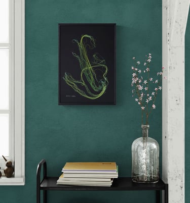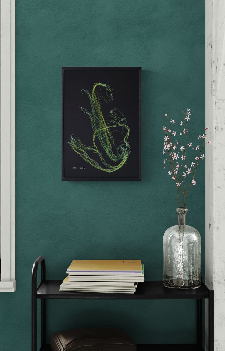 The Qi Dance collection is a theatre of threads, where motion becomes material and silence becomes stage. Each composition is born from the circulation of qi—breath, energy, and presence—translated into lines of reclaimed fibers that hover, twist, and cascade across paper.